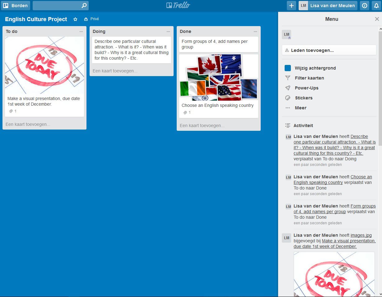 In één van die workshops die ik bijvoorbeeld gevolgd heb op mijn WPL3 op de Friese Poort, ging over online platforms waar studenten en docenten samen kunnen werken. Een voorbeeld daarvan was Trello. Hierin kunnen diverse to-do lijsten gemaakt worden waar je personen aan kunt koppelen. De docent zet hier bijvoorbeeld een opdracht op, koppelt daar de studenten aan en zodra zij hier aan werken zetten ze de opdracht bij de 'doing' lijst. Zodra het af is gaat het naar de 'done' lijst, voegen ze de docent toe, en deze kan het werk dan nakijken en feedback geven. Dit werkt vooral goed wanneer er aan grotere projecten wordt gewerkt, de docent ziet zo wie waar mee bezig en kan studenten er op attenderen wanneer zij nog weinig in de 'done' lijst hebben staan. Ik heb deze toepassing nog niet in de klas met studenten gebruikt, maar ik heb zelf even rondgekeken op de website en een proef pagina aangemaakt.