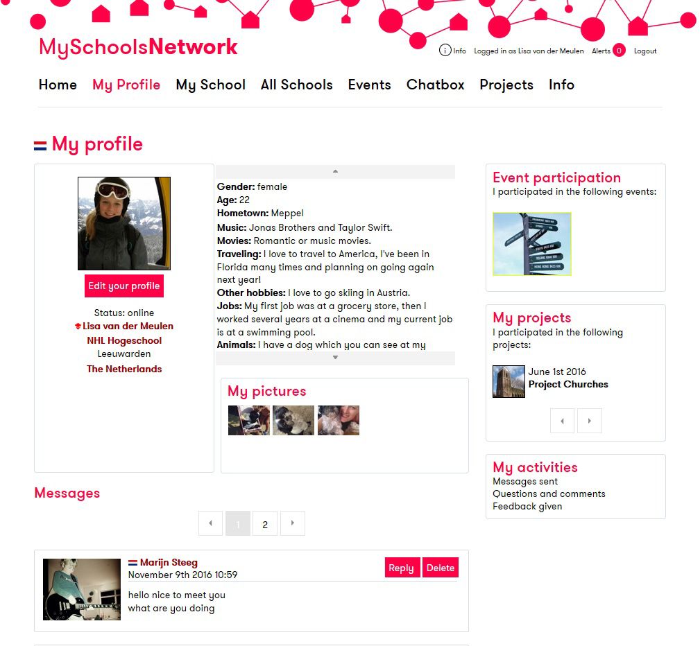 Dit is een platform waar allerlei scholen over de hele wereld aan deelnemen. Het is een volledig afgeschermde website waar scholen klassen voor kunnen aanmelden en deze kunnen hierop dan in contact komen met andere leerlingen uit andere landen. Als docent kun je hier evenementen aanmaken waar de leerlingen dan aan mee kunnen doen. Bijvoorbeeld een evenement over wat de leerling van Thanksgiving vind. Hierover schrijft hij dan een verhaal en andere leerlingen, die bijvoorbeeld uit Amerika of Turkije komen, kunnen hier dan op reageren. Daarnaast zijn er allerlei docenten op actief die de leerlingen kunnen helpen met de Engelse vaardigheden door feedback te geven. Op deze manier leren leerlingen van elkaar over culturele dingen uit verschillende landen. Ook kan er gezamenlijk met scholen uit andere landen aan een project gewerkt worden, dit om nog meer interactie tussen de leerlingen te creëren. Alle berichten op MySchoolsNetwork zijn vrij te lezen door iedereen met een account, hierdoor is er geen sprake van online pesten of andere 'stiekeme' dingen die online zouden kunnen voorkomen. Het is een veilige leeromgeving waar de leerlingen ontzettend veel uit kunnen halen door de sociale contacten met leerlingen uit andere landen.