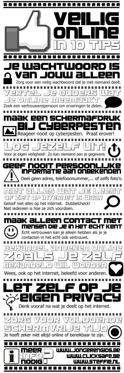 Om jongeren verantwoordelijk om te laten gaan met het gebruik van internet, is het belangrijk dat zij hierover worden voorgelicht. Het goede voorbeeld geven en wijzen op dingen die anders kunnen/moeten. De foto hiernaast laat een poster zien met tips om veilig online te zijn. Ondanks dat mijn studenten op het mbo dit misschien al een klein beetje kinderachtig kunnen vinden, is het alsnog wel goed om hen hierop te wijzen, op deze manier worden ze er namelijk wel bewust mee geconfronteerd. Er is ook een groot scala aan video's beschikbaar waarin op de risico's wordt gewezen. Het erop wijzen is denk ik goed, maar ik ben er geen voorstander om daarop te richten. Ik laat liever zien hoe je op de juiste manier gebruik maakt van internet als dat ik de negatieve aspecten belicht.