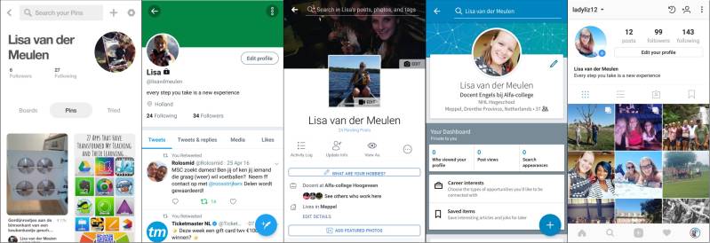 Ik ben op verschillende sociale media aanwezig. Bepaalde sociale media is gericht op persoonlijk vlak, het in contact staan met vrienden maar andere accounts zijn gericht op mijn beroep. De borden op Pinterest zijn gericht op onderwijs en Engels dat ik gebruik voor mijn lessen en daarnaast heb ik LinkedIn account om contact te kunnen maken met anderen in het onderwijs en om gezien te kunnen worden als docent Engels. Accounts die ik vooral voor eigen persoonlijk gebruik heb zijn Twitter, Facebook en Instagram. Op Twitter en Facebook volg ik wel allerlei pagina's die te maken hebben met onderwijs, maar daar zet ik zelf in principe weinig op die hiermee te maken hebben.
