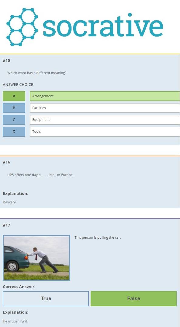 In de Socrative toets als hierboven beschreven maak ik gebruik van verschillende soorten vragen. Hoewel er tijdens deze toets alleen maar naar woorden gevraagd wordt, heb ik toch multiple choice, waar/niet waar en short answer vragen gebruikt. Bij Taalblokken worden alleen multiple choice en waar/niet waar vragen gebruikt maar alle materiaal binnen Taalblokken is gecontroleerd door Malmberg.